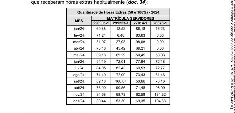 Em um dos exemplos apontados no relatório, nos meses de novembro e dezembro, um mesmo servidor recebeu quase 235 horas extras. Somente no mês novembro foram 134 horas. Em uma conta rápida, este servidor trabalhou cerca de 12 horas todos os 30 dias do mês.