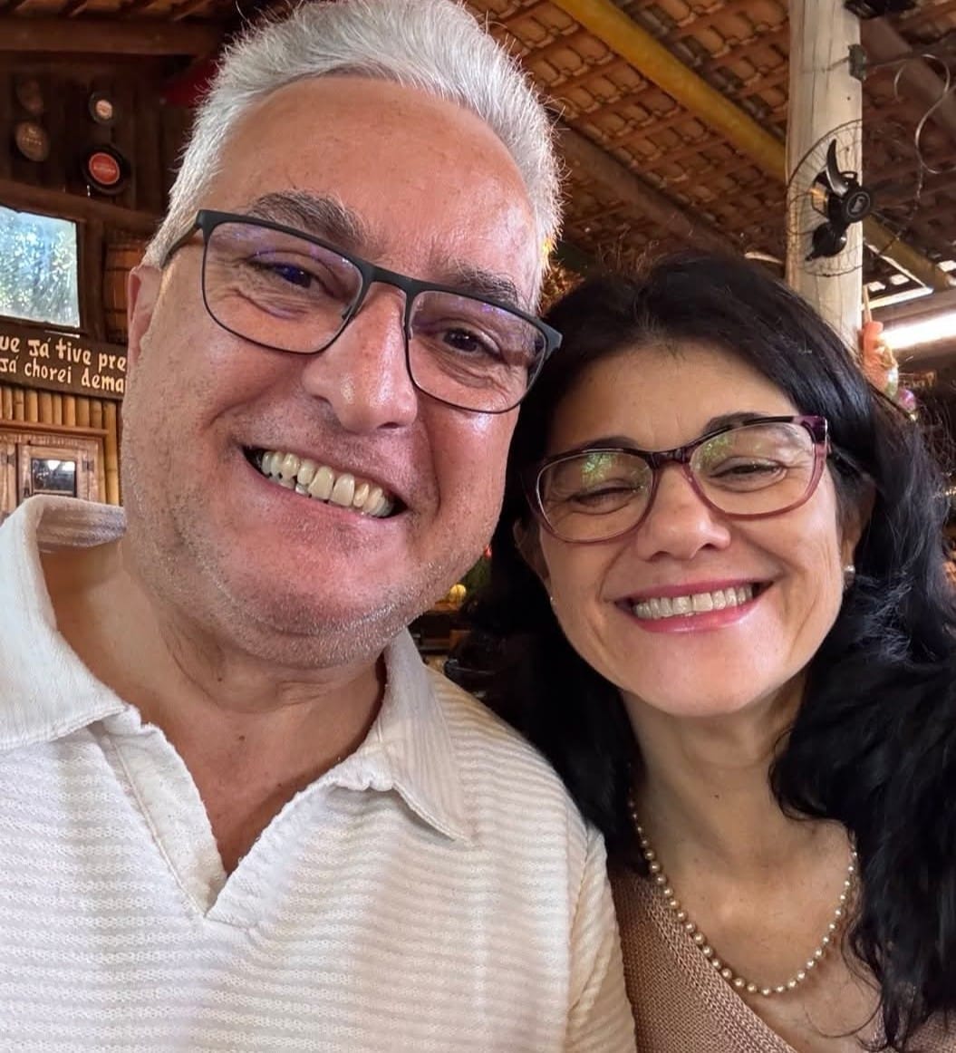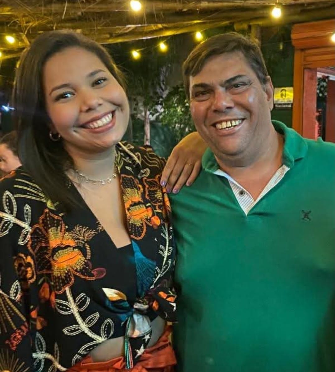 O radialista Edgard Maurício Vicente assume idade nova na próxima terça-feira (5) festejado pela esposa Mara e pela filha Raíssa, que aparece com ele na foto.