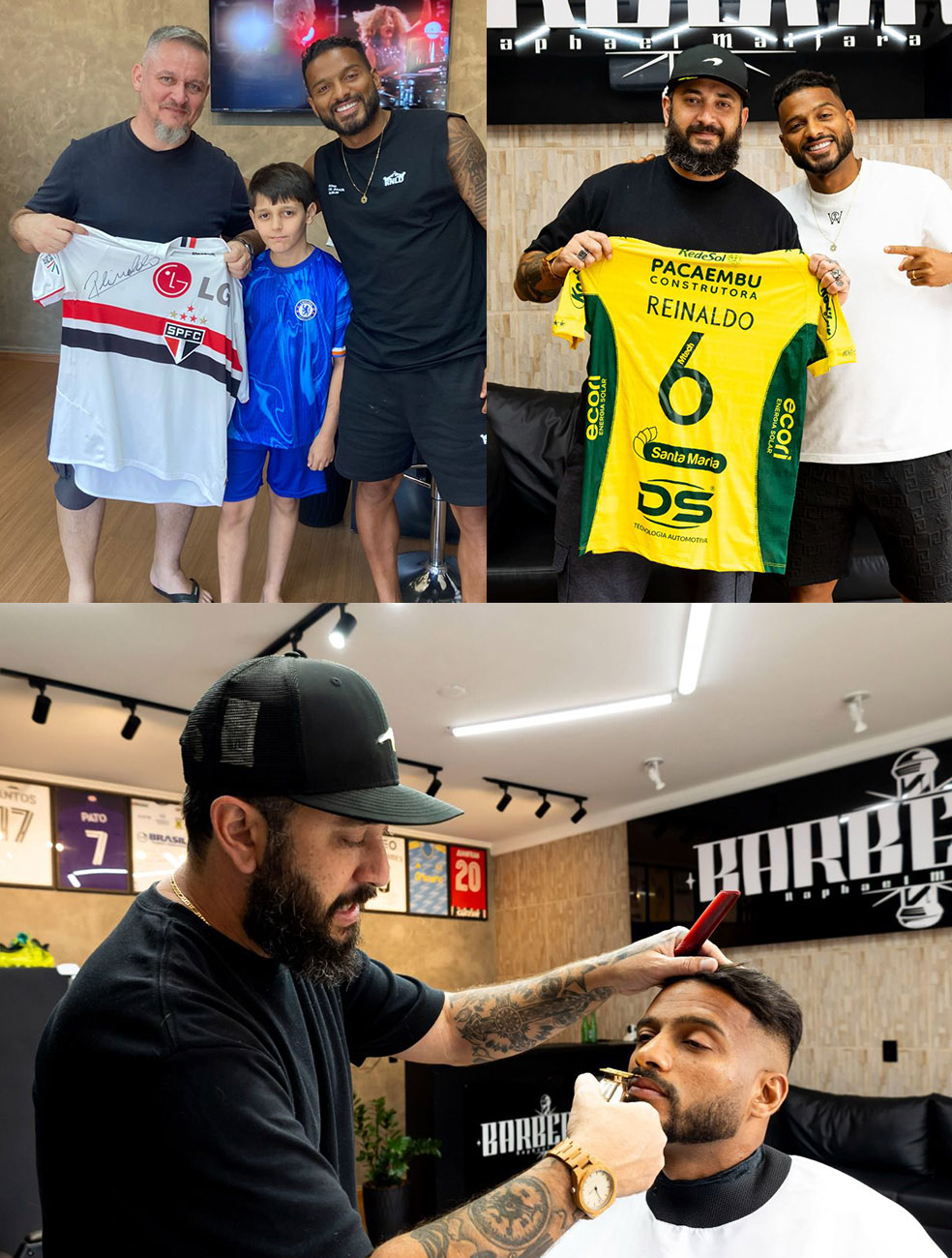 A barbearia Malfará tem se destacado como um verdadeiro ponto de encontro para amantes do estilo e da elegância na cidade. Recentemente, Rafhael Malfará, proprietário da barbearia, teve o privilégio de receber a visita do jogador Reinaldo, Mirassol FC. Sua presença não apenas enaltece o ambiente, mas também fortalece a conexão entre o esporte, a moda e a cultura local. Em uma das suas passagens, Reinaldo atendeu fãs e autografou uma camisa do São Paulo FC, seu ex-clube. O local é espaço que combina tradição, bom gosto e competência, sempre oferecendo o melhor em cuidados masculinos, com a presença de uma figura ilustre que inspira clientes e fãs. Reinaldo e Rafhael Malfará são amigos desde quando o atleta atuava pelo Tricolor e o profissional tinha sua barbearia em Cotia, na Grande São Paulo. Na foto à esquerda, Reinaldo atende fãs, como são-paulino Ricardo e seu filho Matheus.